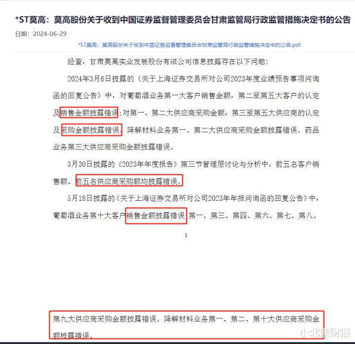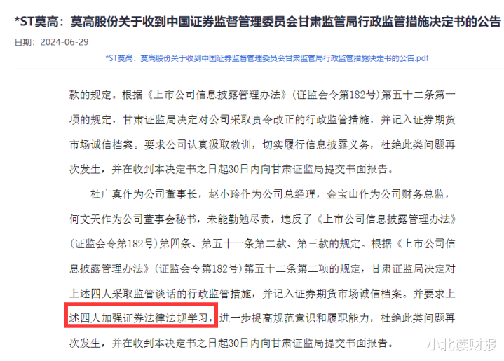 甘肃证券监管局在给莫高股份的监管决定书里指出: